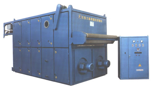 b、特殊設(shè)計的波形風(fēng)道使織物完全在熱風(fēng)的帶動下自由向前運行,織物在波形風(fēng)道內(nèi)上下激烈抖動,強氣流的作用使毛圈得到充分豎立,織物的纖維組織經(jīng)熱風(fēng)吹刷后,在纖維表面水分子受熱氣化成膜,隨即被破壞和再生,使得毛圈織物得以烘干。