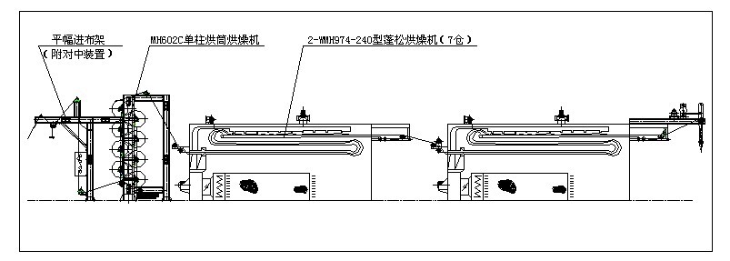 平幅進布架→MH602單住烘燥機→WMH974型蓬松烘燥機(2臺)→平幅落布
