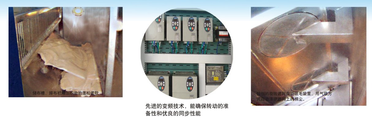 獨(dú)創(chuàng)的旋轉(zhuǎn)濾網(wǎng)自動(dòng)吸毛裝置用氣吸方式自動(dòng)清理濾網(wǎng)上的棉塵,連續(xù)不斷實(shí)時(shí)收集,保證了被處理織物的高效烘燥。