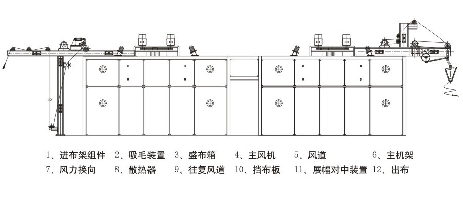 本機(jī)采用交替?zhèn)鬟_(dá)織物的原理,在噴射的熱氣流的推動(dòng)下在風(fēng)盒內(nèi)往復(fù)運(yùn)動(dòng)并被拍打?椢锢w維正反向均衡吹拂,使織物毛圈得以充分豎立、蓬松,提高了手感,使織物達(dá)到較高的縮水值。儲(chǔ)布斗里容布使機(jī)內(nèi)的容布量增加?椢镌跈C(jī)內(nèi)有充分的烘干時(shí)間,從而達(dá)到高效烘干的目的。